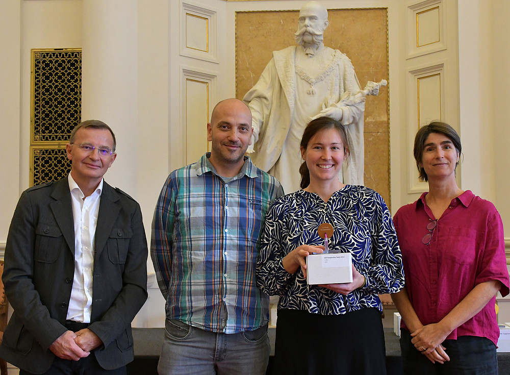 Unser Team bestehend aus Simone Adams und Barbora Orlická (Mediendidaktik) sowie Roland Radlinger und Alexey Moiseev (Medienproduktion) durfte den Preis für die Produktion der digitalen Lernstrecke für Ethikanträge entgegennehmen.