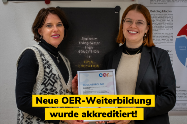 Das Forum Neue Medien in der Lehre Austria hat die modulare Weiterbildung zum:zur OER-Praktiker:in der Universität Graz akkreditiert. Ein unabhängiger Beirat hat bestätigt, dass wir mit dieser Weiterbildung die Kompetenzentwicklung von Hochschulmitarbeiter:innen im Bereich OER fördern. Die Teilnehmenden der Weiterbildung können damit zukünftig das österreichweit gültige Zertifikat zur OER-Praktiker:in erhalten.